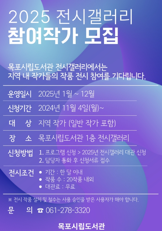 ![]() 목포시립도서관, 2025년 전시갤러리 운영 참여작가 모집 |