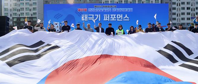 ![]() ‘제37회 전라남도 교육감기 단축마라톤대회’에서 태극기 퍼포먼스가 진행되고 있다. |