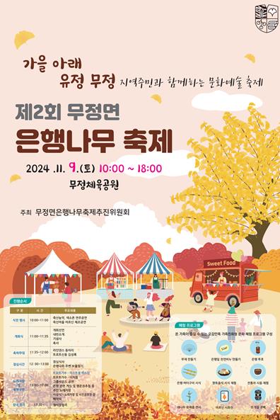정일남 무정면 은행나무축제 추진위원장은 “아름다운 가을 풍경이 펼쳐지는 무정면에서 소중한 분들과 특별한 시간을 보내시고, 많은 분이 오셔서 무정의 자연과 속에서 가을 감성을 듬뿍 담아 가시기 바란다”라고 말했다.