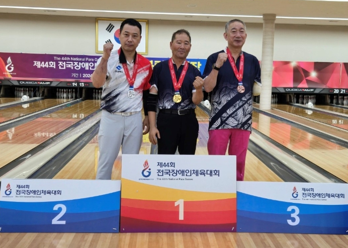 ![]() 광명시 선수단이 제44회 전국장애인체육대회 경기도 대표로 출전해, 금 3개, 은 2개, 동 1개 총 5개 메달을 획득하여 경기도의 종합 우승에 크게 기여했다. 사진은 지난 10월 28일 경남 창원시 골든힐볼링장에서 열린 제44회 전국장애인체육대회 볼링 남자 개인전에서 광명시 오영일 선수(사진 가운데)가 금메달을 걸로 기념사진을 촬영하는 모습. |