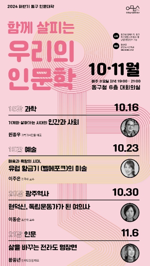 임택 동구청장은 “ 전라도와 지역을 사랑하고 지역문화의 다양성을 위해 쉼 없이 활동해 온 황풍년 강사와 함께 전라도의 명장면을 되새기는 힐링의 시간이 되길 바란다”면서 “시민들과 함께 성장하며 따뜻한 위로를 건넸던 동구인문대학이 내년에도 차질없이 진행될 수 있도록 하겠다”고 말했다.