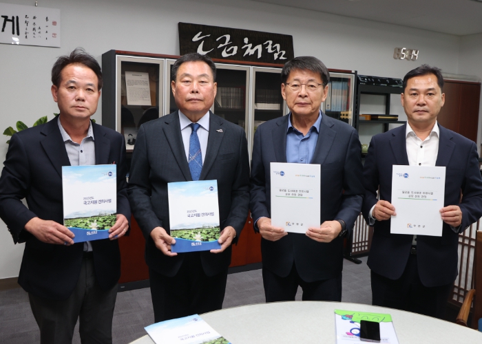![]() 국회를 방문하여 사업 설명 후 진행된 기념촬영(왼쪽부터 임현수 군의원, 김산 군수, 서삼석 국회의원, 이호성 군의장) |
