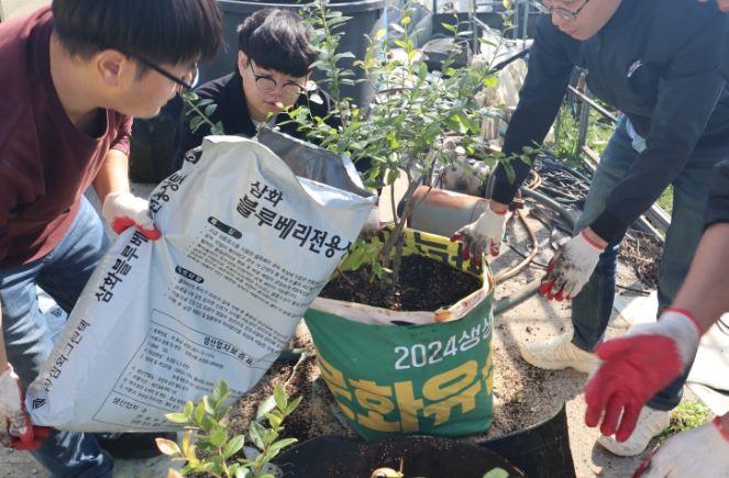 ![]() 수북면 궁산리의 농가: 지난 달 자신의 블루베리 하우스에서 기존의 낡아서 찢어지기 시작한 부직포 화분을 폐현수막 농작물 화분으로 옮겨 심는 작업을 진행했다. |