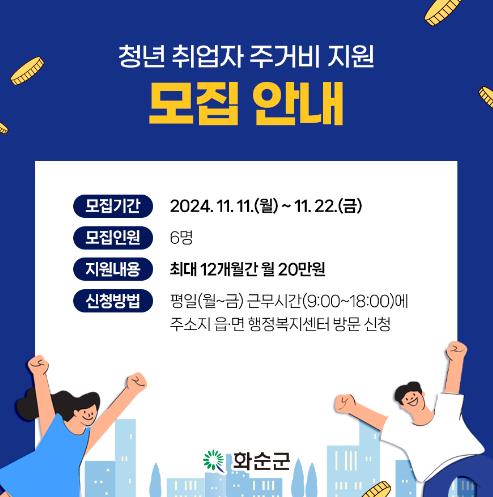 ‘청년 취업자 주거비 지원 사업’은 화순군에 거주하는 일하는 청년들에게 주거비(전·월세)를 월 20만 원씩 최대 12개월간 지원하여 청년들의 경제적 부담을 덜어주고 화순에 안정적으로 정착할 수 있도록 돕기 위해 추진 중인 사업이다.
