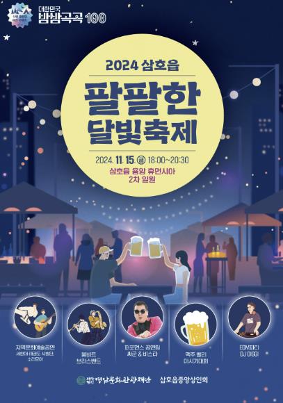 팔팔한 삼호읍 달빛축제는 삼호읍 풍물패의 흥겨운 식전 공연을 시작으로 세한대학교 태권도 시범과 소리 모아 동호회의 통기타 연주로 열린다. 이어 등장하는 이미테이션 싸이 ‘싸군’은 인기 가수의 노래를 자신만의 스타일로 재해석해 많은 사랑을 받아온 모창 퍼포머로 그의 개성 넘치는 무대로 본 공연이 시작된다.