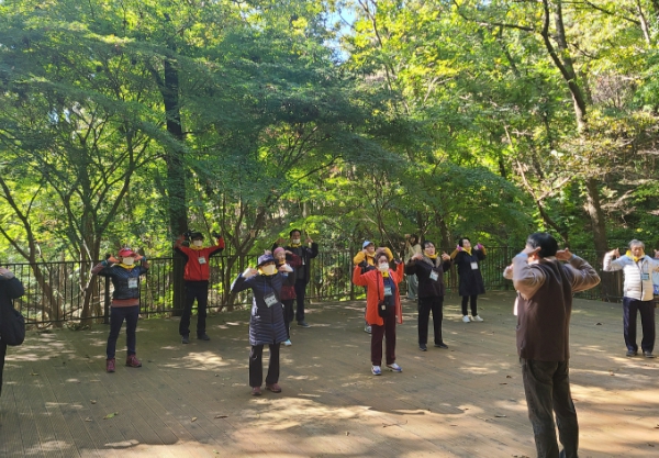 참여 주민, 어르신들은 이날 금성산 숲 치유, 손의 소근육을 자극하는 잔 받침 만들기 체험 등을 진행했다. '끝'