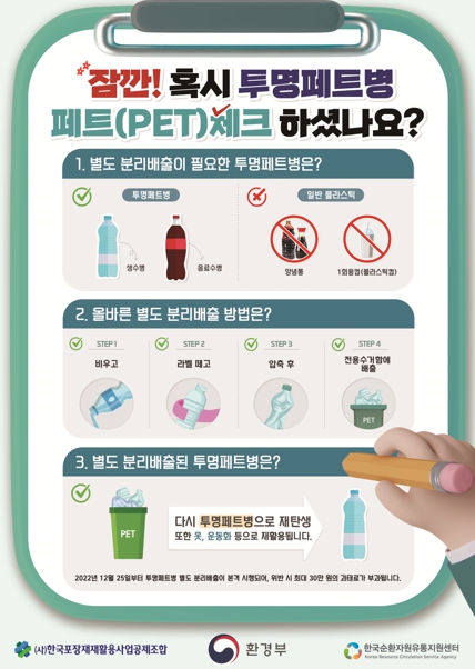 정미경 자원순환과장은 “제도 정착을 위해서는 무엇보다 시민 참여가 중요하다”며 “쓰레기를 버리는게 아닌 자원을 배출한다는 생각으로 투명페트병을 올바르게 분리배출해 주길 당부드린다”고 말했다.