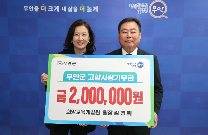 희망교육개발원 김경희 원장은 2년 연속 무안군 고향사랑기부제에 참여함으로써 올해로 시행 2년 차를 맞이한 고향사랑기부제가 더욱 활성화하고 지속 가능한 발전 동력을 확보하는 데 힘을 보탰다.