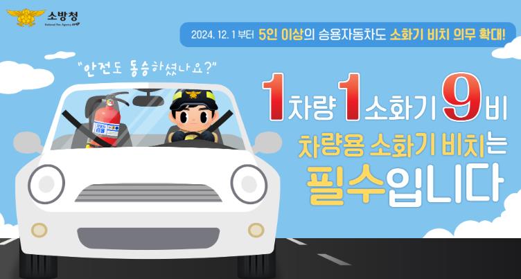 현재 차량용 소화기의 설치 및 비치 의무대상은 7인승 이상으로 규정하고 잇지만 오는 12월 1일부터는 5인승 이상 차량에 의무비치가 확대된다.