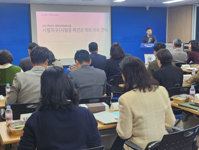 ![]() 전남교육청 청사 중회의실에서 ‘2025학년도 대학수학능력시험 지구‧시험장 파견관 회의’가 진행되고 있다. |