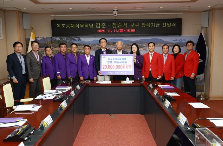 ![]() (재)신안군장학재단에 장학기금 2,000만 원 기탁, 목포 ‘등대식육식당’대표 김준·정순심 부부 |