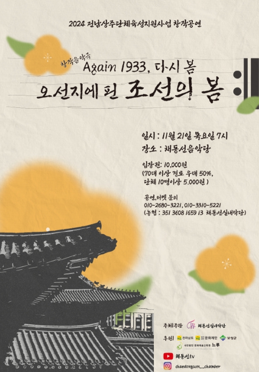 ‘Again 1933, 다시 봄’은 보성 경전선 개통과 채동선실내악단이 창단된 1933년도 일제강점기 시절 음악을 통해 시대의 아픔을 치유하고 희망을 전파했던 음악가들의 이야기를 담아낸 창작 음악극이다.