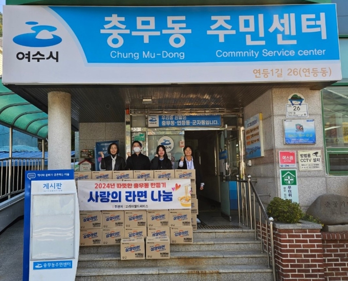 ![]() 코리아월드써비스㈜(대표 김완식)는 지난 12일 충무동 취약계층의 따뜻한 겨울나기를 위해 충무동 주민센터에 500만 원 상당의 라면 200박스를 전달했다. |