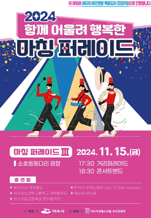 이날 국내 최고 마칭팀인 ‘매드라인 마칭밴드’와 타악기 오케스트라 ‘조이 오브 퍼커션(Joy Of Percussion)’, 여수정보과학고와 공업고 관악합주단, 체리쉬 댄스팀 등의 공연이 준비됐다.