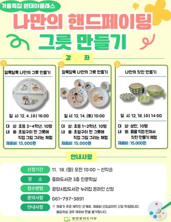 광양중마도서관은 자신만의 개성 있는 작품을 만들며 창의력을 키우고 성취감을 느낄 수 있도록 ▲알록달록 핸드페인팅 그릇 만들기(초등 1-2학년), (초등3-4학년) ▲나만의 찻잔 만들기(성인) 총 3개 강좌로 프로그램을 구성했다.