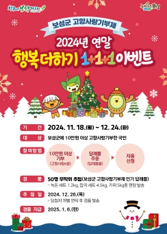 ![]() 보성군, 고향사랑기부제 연말 행복더하기(1+1+1) 이벤트_ 보성군, 고향사랑기부제 연말 행복더하기(1+1+1) 이벤트 포스터 |