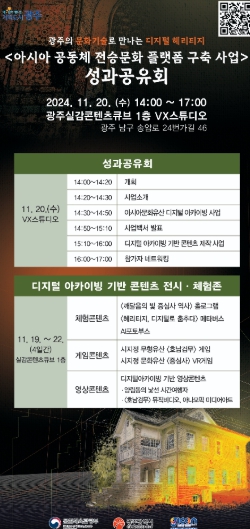 이날 성과 공유회에는 ‘아시아 공동체 전승문화 플랫폼’ 사업에 참여한 한국전자기술연구원(KETI)과 전남대 산학협력단을 비롯해 ㈜위프코, ㈜피씨앤, ㈜위치스, ㈜엠투테크, 국제개발협력실행연구원 등 지역문화유산 관계기관과 콘텐츠기업 관계자들이 참석했다.