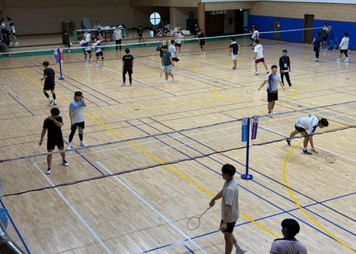 ![]() 전국 대학 배드민턴 선수들이 강진 제2실내체육관에서 경기에 앞서 연습을 하고 있다. |