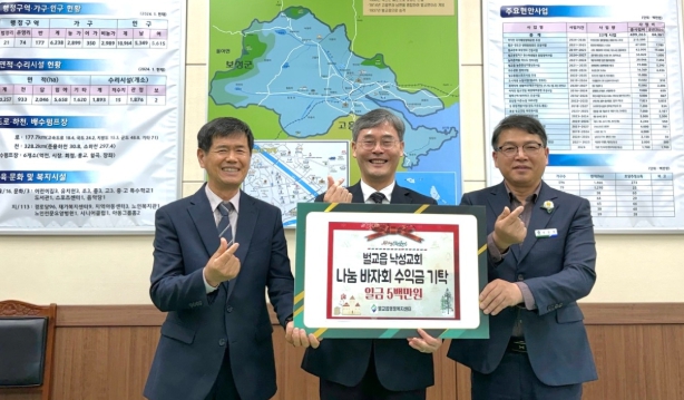 ![]() 보성군, 벌교읍 낙성교회 사랑나눔 바자회 수익금 5백만 원 전액 기부_ 사랑나눔 바자회에서 모금된 수익금 5백만 원 전액을 지역사회 소외계층 지원을 위해 기부했다_(왼쪽부터 이동교 장로_윤명현 목사_서진석 읍장) |
