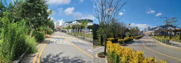 ![]() 나주초등학교와 이화유치원 어린이보호구역 내 ‘자녀안심 그린숲’ 조성 전후 모습. (사진제공-나주시) |