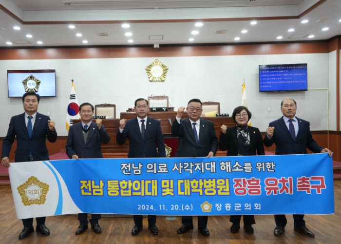 이에 장흥군의회는 정부와 전라남도에 ▲전남도립대 장흥캠퍼스에 의과대학 설립 ▲장흥통합의료병원의 부속병원 지정 ▲2026학년도 개교를 위한 신입생 정원 배정과 지원을 촉구했다.