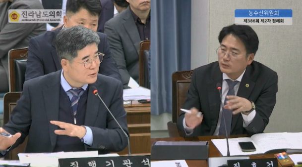 ![]() 진호건 의원이 지난 11월 20일 농축산식품국 소관 추경예산심사에서 국장에게 질의하고 있다. |