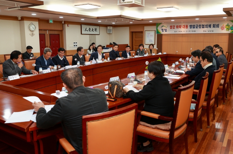 21일 영암군청에서 영암군의회 의원, 지역농협·농업인단체·사회단체 대표 등이 참여한 가운데 ‘쌀값 하락 대응 영암군민협의체’ 회의가 열렸다.
