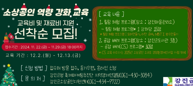 이 프로그램은 강진군에 거주하는 소상공인과 예비창업자 90명을 대상으로 하며, 참가자의 교육비 및 재료비를 지원하기 때문에 자부담이 없다.