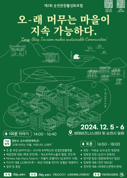 시 관계자는 “지난 7월에 이어 이번 두 번째 포럼은 관광산업의 핵심인 매력적인 숙박을 매개로 한 스테이형 상품 개발을 통해 지속가능한 관광 실현 방안을 모색하고자 한다”며 “포럼을 통해 도출된 방안을 통해 여행자와 지역민이 상생하는 지속가능 관광도시 순천을 만들 수 있도록 노력하겠다”고 밝혔다.