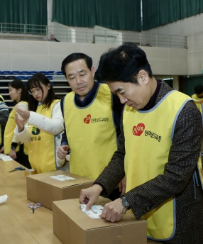 ![]() 김대중 교육감과 도교육청 간부들이 후원 물품을 포장하고 있다. |