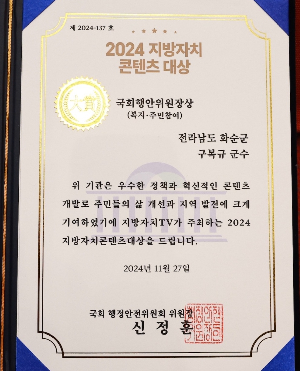 ![]() 2024 지방자치 콘텐츠 대상(복지주민 참여 부문) 상장 |