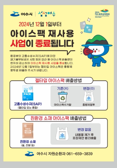 ![]() 여수시는 젤 타입(고흡수성수지) 아이스팩 재사용 사업을 오는 12월 1일부터 중단한다고 밝혔다. |