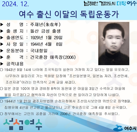 ![]() 여수시가 12월의 독립운동가로 돌산 금성 태생 ‘주재년(朱在年) 선생’을 선정했다. |