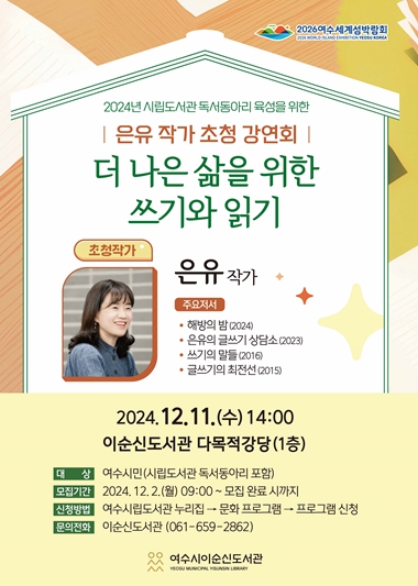 ![]() 여수시이순신도서관이 12월 11일 오후 2시 다목적강당에서 ‘더 나은 삶을 위한 쓰기와 읽기’를 주제로 은유 작가 초청 강연회를 개최한다. |