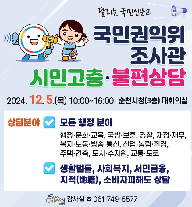 상담을 원하시는 시민은 읍면동 행정복지센터 또는 순천시 감사실을 통해 사전 상담 예약을 접수할 수 있으며, 당일 현장 접수도 가능하다.