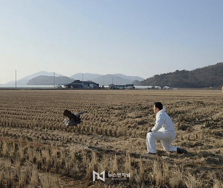 ![]() 순천만 인근 농경지에서 위치추적기를 부착한 흑두루미를 방사하고 있다./ 순천군 제공 |