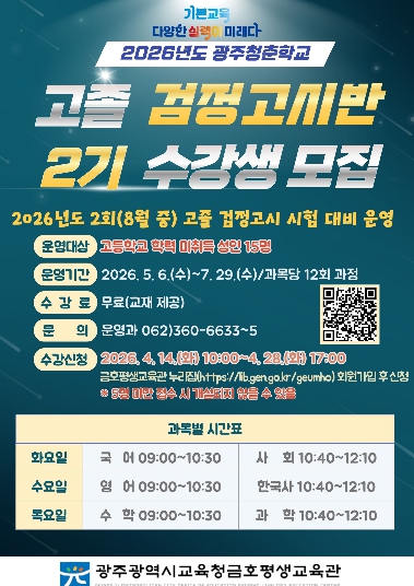 ![]() [포스터] 광주 금호평생교육관, ‘고졸 검정고시반’ 2기 운영 |