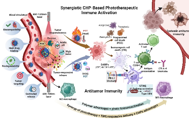 다당류 고분자 기반 광반응성 플랫폼은 레이저 조사 시 종양 조직에서만 활성화되며, 면역원성 세포사멸(immunogenic cell death)을 유도한다.