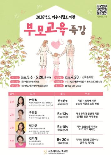 모집 대상은 육아 중인 여수시민으로 수강 신청은 4월 20일 오전 9시부터 여수시립도서관 누리집 문화프로그램 코너를 통해 가능하다.