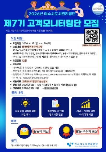 ![]() 여수시도시관리공단, “제7기 고객모니터링단” 모집... 시민 참여로 서비스 품질 높인다 |