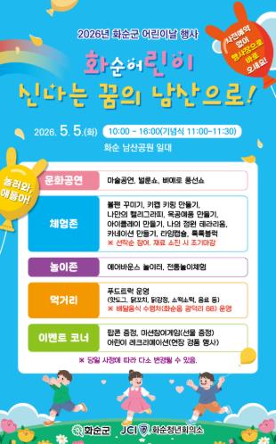 군은 오는 5월 5일 남산공원 일원에서 ‘화순 어린이 신나는 꿈의 남산으로’를 부제로 한 ‘2026년 화순군 어린이날 행사’를 개최한다.