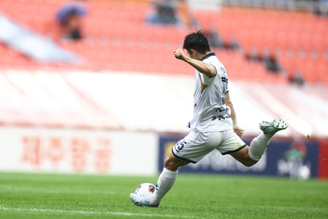 ![]() 4월 18일 제주 원정경기에서 김천상무 박태준이 프리킥을 차고 있다 |