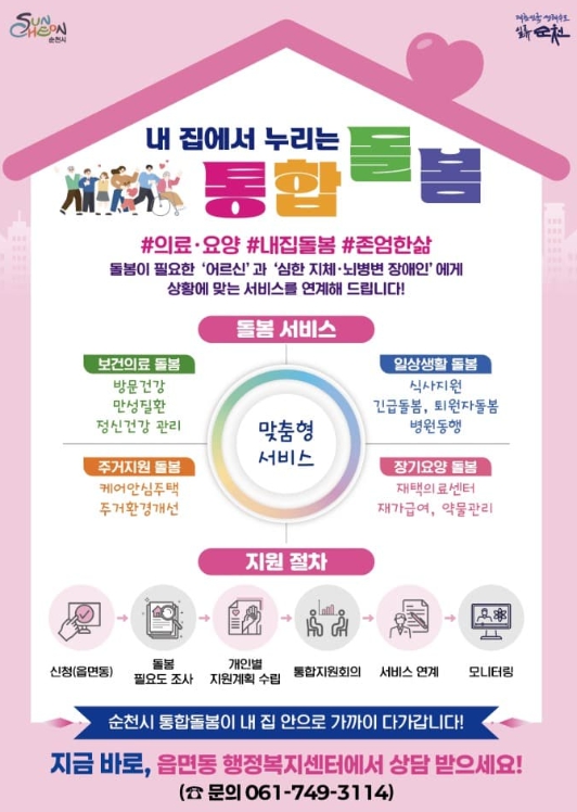 한편 통합돌봄 서비스 신청은 주소지 읍면동 행정복지센터에서 방문 신청할 수 있으며, 자세한 사항은 읍면동 행정복지센터 또는 순천시 콜센터로 문의하면 안내받을 수 있다.