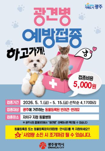 배귀숙 농업동물정책과장은 “소중한 반려동물의 건강과 시민 안전을 위해 광견병 예방접종에 적극 참여해주기를 바란다”며 “앞으로도 사람과 동물이 안전하게 공존할 수 있는 환경 조성에 최선을 다하겠다”고 말했다.