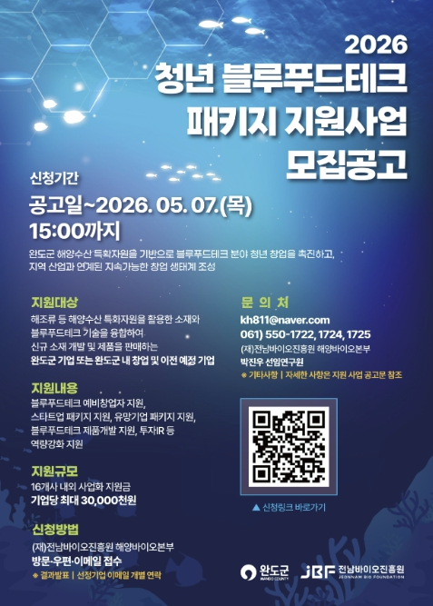 ![]() 완도군, 청년 블루푸드테크 지원 사업 참가자 모집 |