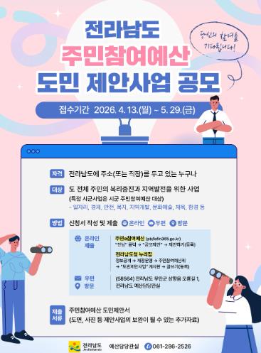 제갈래원 전남도 예산담당관은 “주민참여예산제도는 주민의 목소리가 도정에 반영되는 중요한 제도”라며 “도민 한 분 한 분의 다양한 의견이 정책으로 이어지도록 많은 관심과 참여를 부탁드린다”고 말했다.