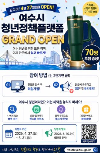 ![]() 여수시 청년정책플랫폼 그랜드 오픈 이벤트 포스터 |