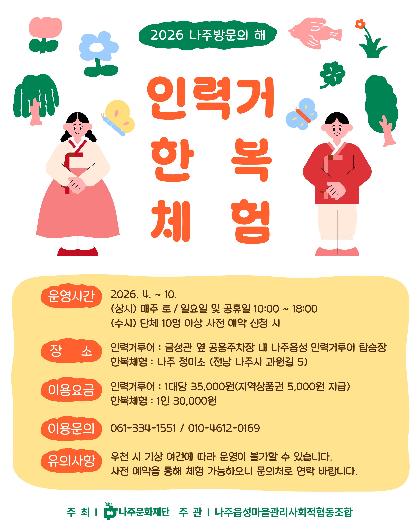 ![]() 나주문화재단이 ‘2026 나주방문의 해’를 맞아 인력거투어와 한복체험 프로그램을 운영한다. |