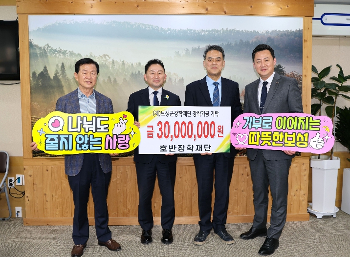 ![]() 호반장학재단이 보성군장학재단에 3,000만 원 기탁_(보성군장학재단이사장 문찬오, 보성부군수 이상철, 호반그룹 커뮤니케이션 실장 김영락, 호반장학재단 사무국장 송진오) |
