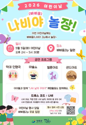 행사장에는 ‘나비 로드’가 조성되며, 드레스코드는 ‘나비’로 설정돼 나비 날개, 머리띠 등 다양한 소품과 의상을 활용해 아이들이 축제의 한 장면을 직접 완성하게 된다.